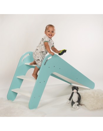 Jedes Detail ist sorgfältig durchdacht. Dabei steht die Sicherheit an oberster Stelle. Die Rutsche ist kippsicher und es gibt keine scharfen Ecken und Kanten, an denen sich die Kleinen verletzen können. Zwei trittfeste Stufen, die so gestaltet sind, dass das Kind mit dem kompletten Fuß auftreten kann, sorgen für ein angenehmes Hinauf- und Hinabsteigen. Der ergonomische Handlauf erleichtert Kindern das Erklettern des Podestes und gibt ihnen zusätzlich Stabilität und Sicherheit. Eltern ermöglicht der Handlauf das einfache Versetzen der Rutsche von einem Raum in den anderen oder bei schönem und trockenem Wetter vielleicht auch mal in den Garten. Die ca. 114 cm lange Rutschfläche mit den hohen Seitenwänden erlaubt ein sicheres Heruntergleiten, damit dem fröhlichen Rutschvergnügen nichts mehr im Wege steht.