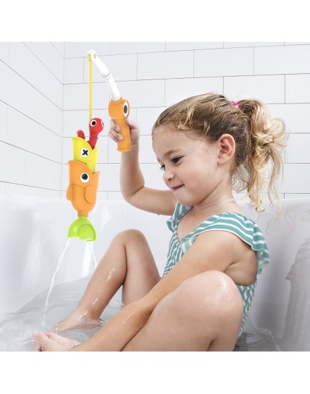 Die farbenfrohen Fische, sind so designed, dass sie nach oben gerichtet im Wasser schwimmen und dadurch jederzeit bereit sind, gefischt zu werden. Hat man einen Fisch am Haken und aus dem Wasser gezogen, faszinieren sie die Kinder mit überraschenden Wasser-Effekten, es dreht sich ein Wassserrad, Wasser strömt aus unterschiedlichen Öffnungen oder auch das beliebte Kuckuckspiel begeistert die Kleinen, wenn ein zweiter Fisch aus dem ersten erscheint.